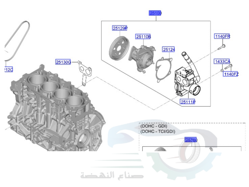 مضخة الماء أو WATER PUMP هي جزء أساسي في نظام التبريد الخاص بالمحرك. وظيفتها الرئيسية هي تدوير سائل التبريد (Coolant) بين المحرك والردياتير، مما يساعد على الحفاظ على درجة حرارة المحرك المثلى ومنع ارتفاع حرارته.