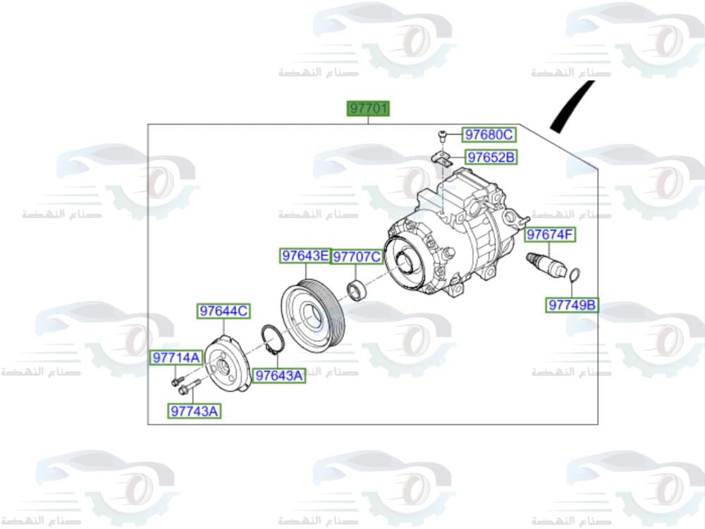 الموقع: يوجد عادة في مقدمة المحرك، ويرتبط به سير (belt) يُعرف بسير المكيف أو السير الرئيسي.